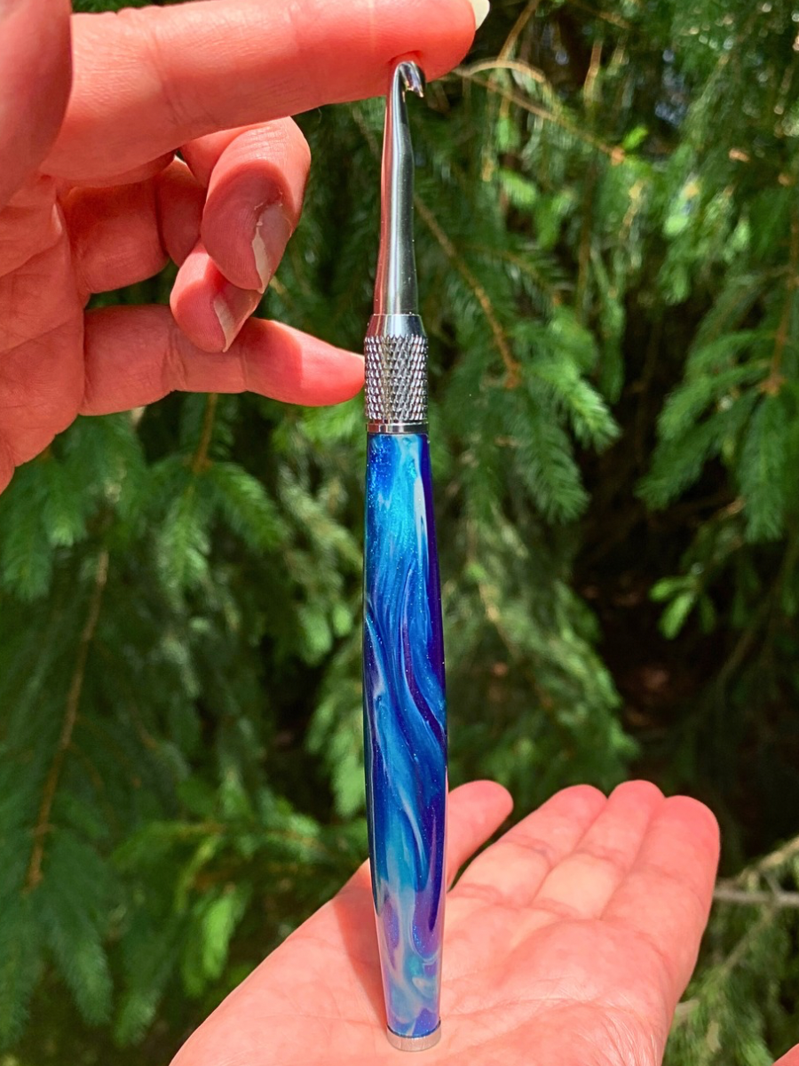 A lovely hand turned handle made from “Island Waters” deluxe resin pattern.