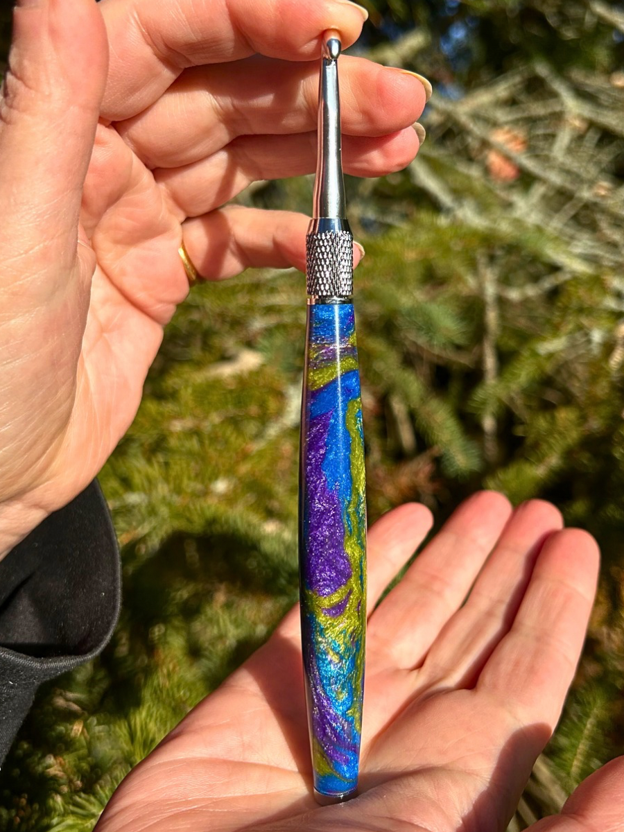 A lovely hand turned handle made from “Cosmic Grape” resin.