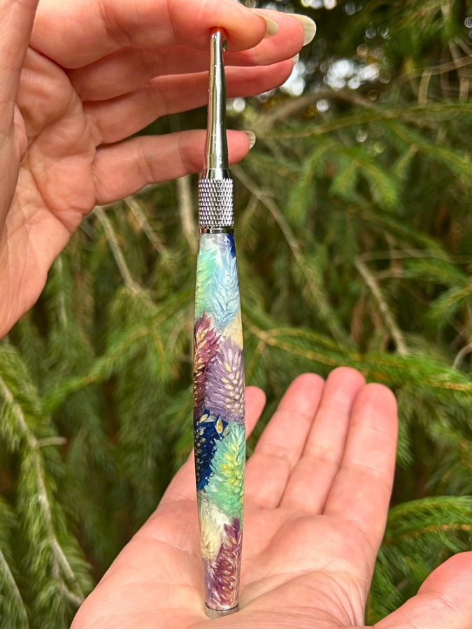 Our most exotic crochet handle. Filled with REAL dried flowers and feathers. Flowers have been cast in a clear resin. Glimpses of white tube can be seen in the middle of the handle.