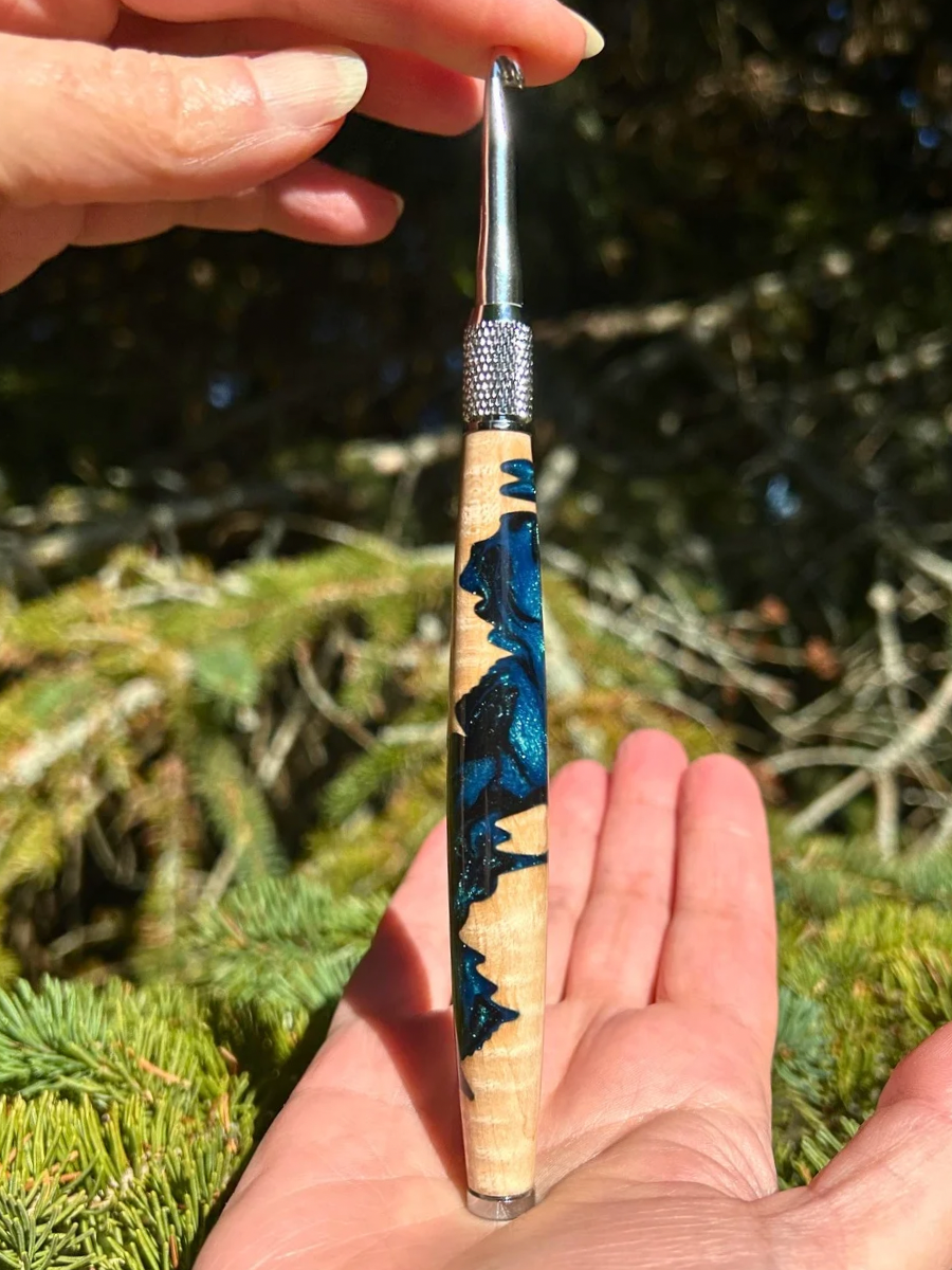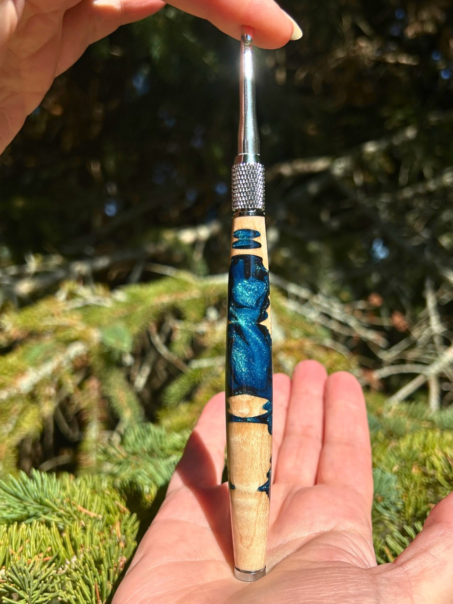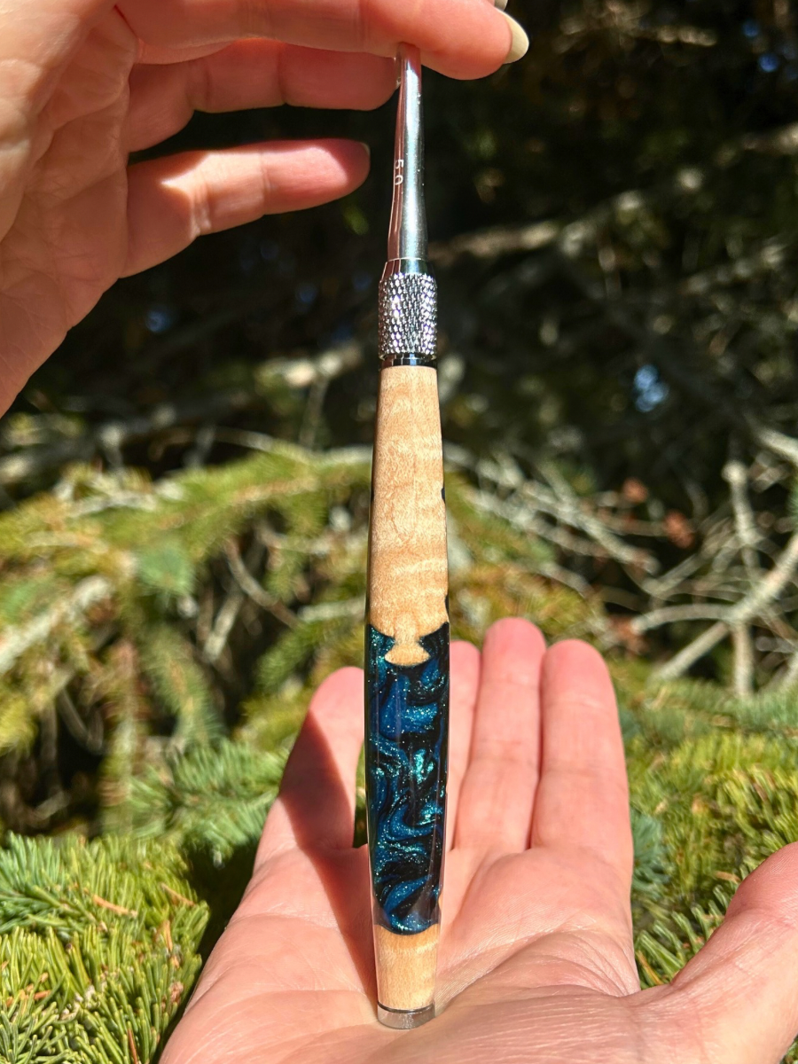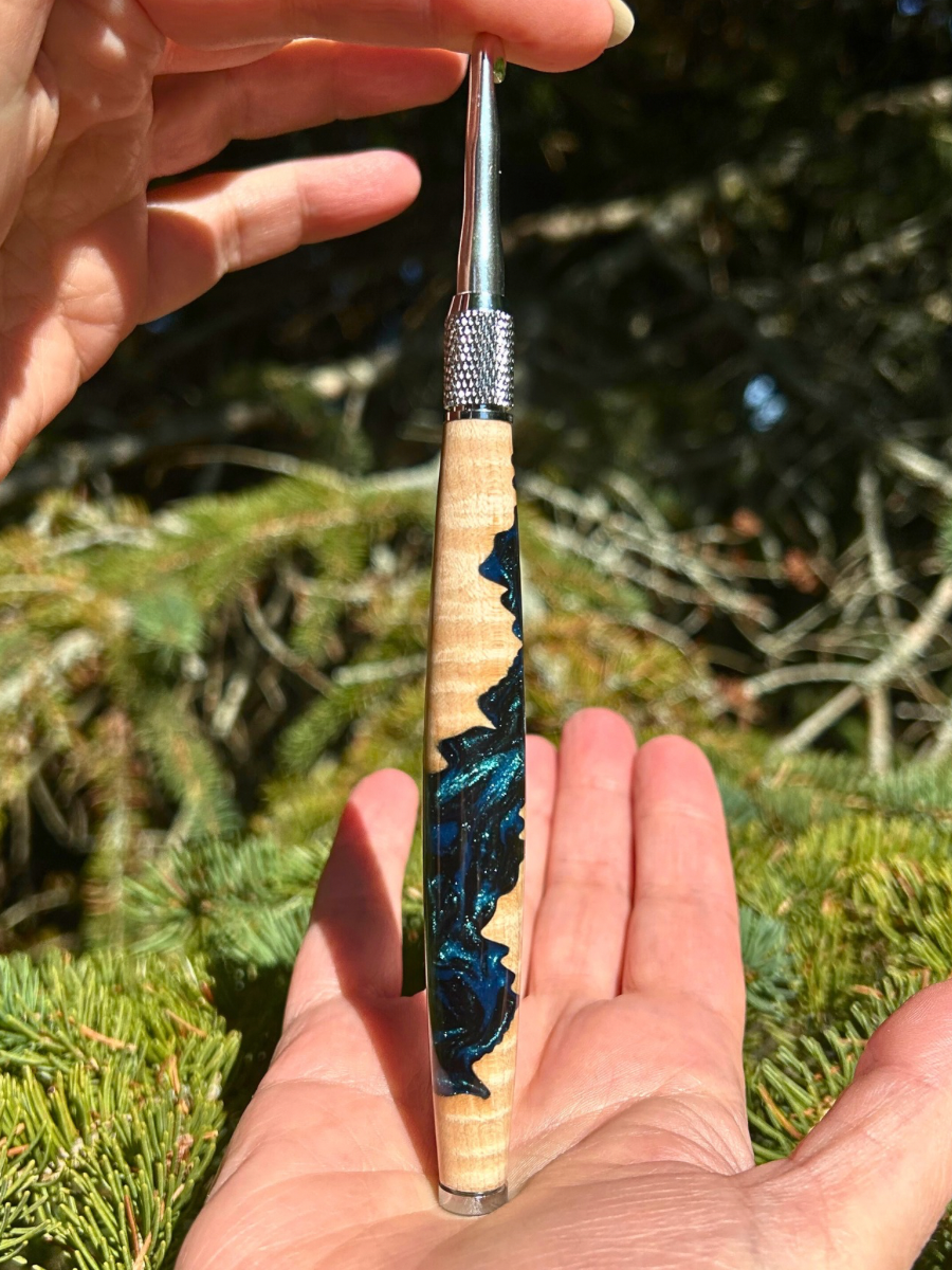 A lovely hand turned handle made from “Emerald Bay” Fusion, which is a combination of curly Maple with colored resins.