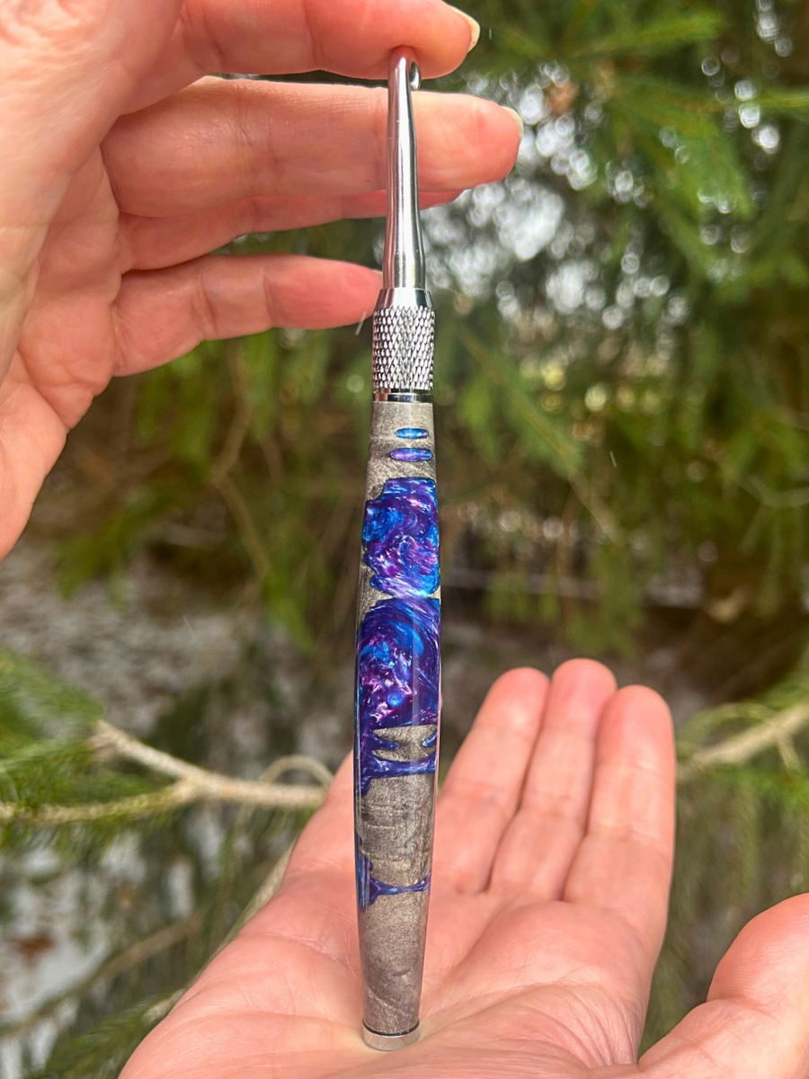 A lovely hand turned handle made from “Purple Tide” Fusion, which is a combination of burled & spalted wood with colored purple and blue resins.
